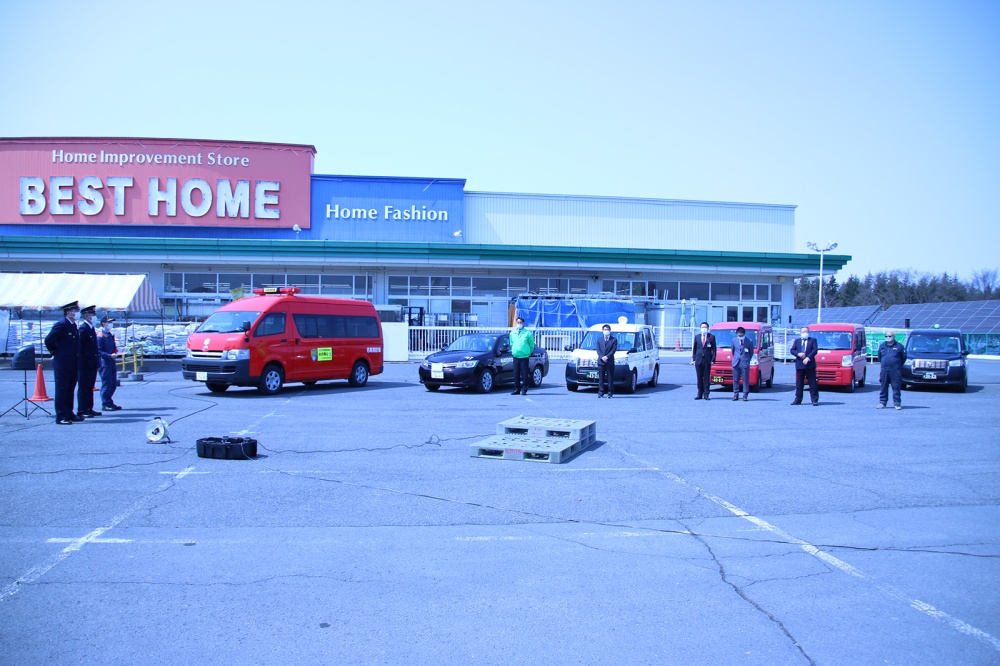 ベストホーム名寄店駐車場で春の全道火災予防運動の出陣式が行われました。