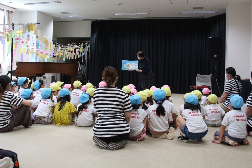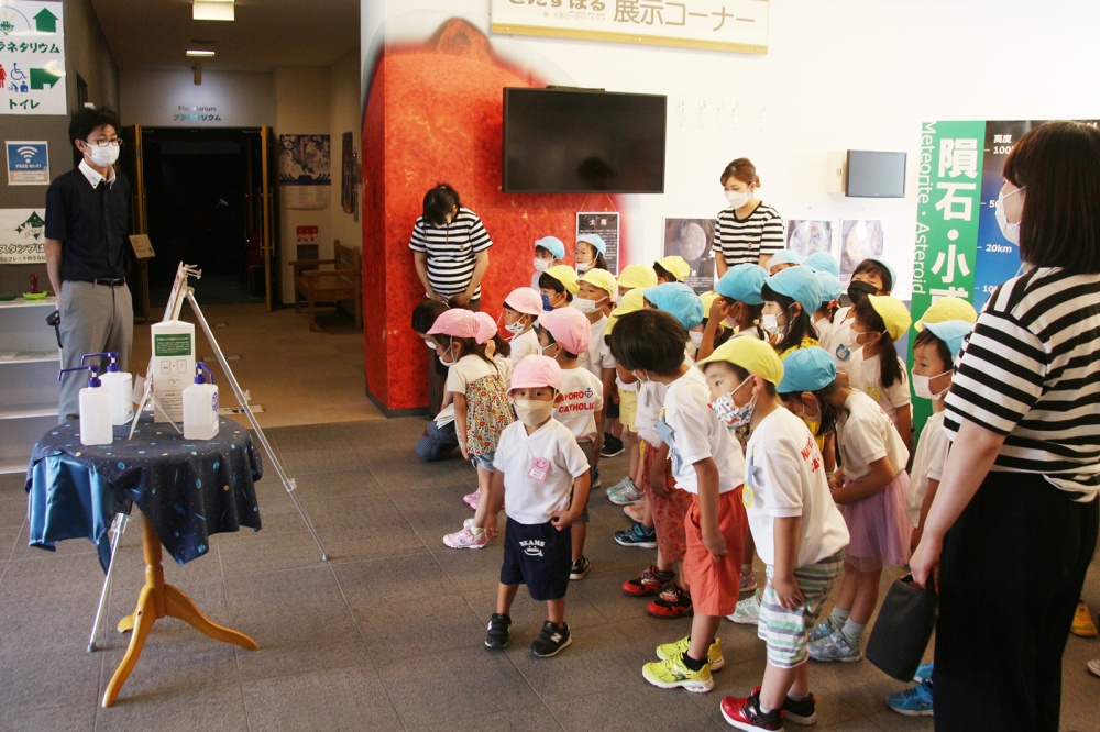 本日はカトリック幼稚園の園児78人が2グループに分かれて訪問、七夕に関する作品の読み聞かせ、事前に作成した短冊の飾りつけ、最後に七夕に関するプラネタリウムを鑑賞しました。