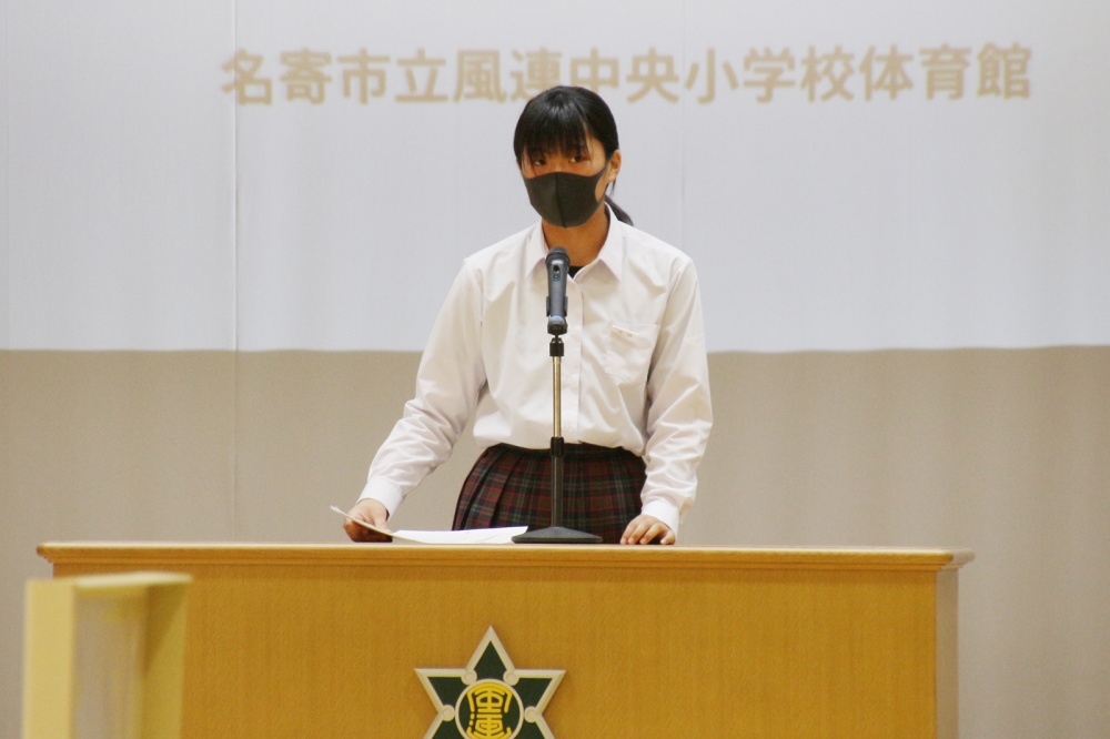 終わりに、風連中学校生徒会の今村恕那会長より「意見交流で他校の取り組みを知ることができ良かった。今後もいじめに悩む生徒がいなくなるように児童会・生徒会で頑張ろう」とあいさつし、本サミットがとても有意義なものになったとお礼の言葉を述べました。