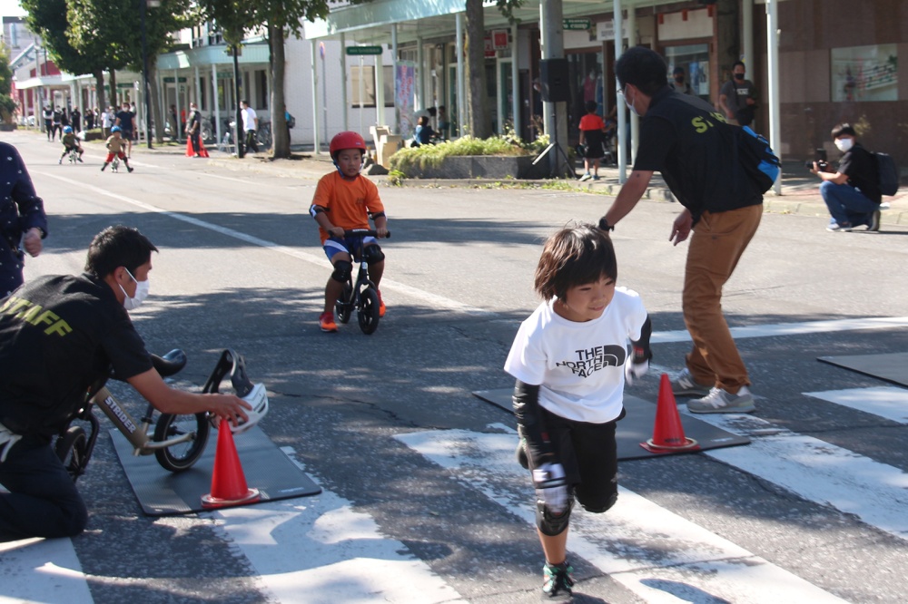 その後競技が開始し、まず始めに4~6歳が対象の「ランニングバイク」(74.6メートルの距離をランニングバイクで走る競技)が行われ、ペダルのない二輪車に乗ってスタートと同時にダッシュ。