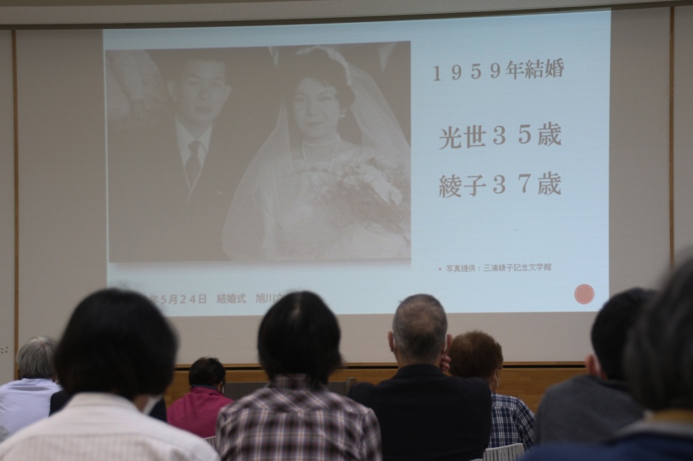 まず、生誕100年を迎えた三浦綾子さんの劇的な半生について解説。三浦綾子さんがどのような経緯で作家としてデビューし、活躍したのか分かりやすく説明されました。