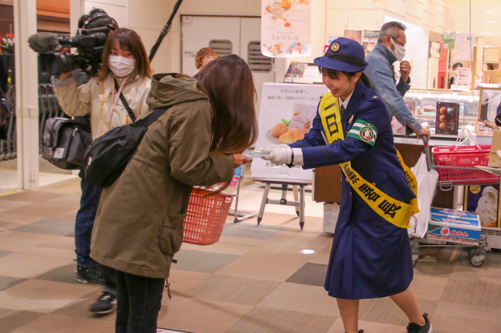 その後は店内を歩き、オリジナルの夜光反射材を配布しながら交通安全を呼びかけていました。