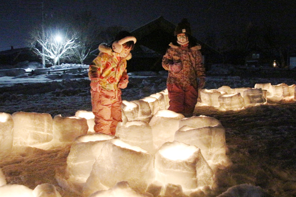 時折雪がちらつく曇り空の中、15時からスノーランタン作成がスタート。雪をブロック状に切り出し、ローソクを差し込む穴を開け、ランタン状に雪を削っていきます。