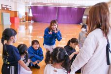 隣の会場、風連農村環境改善センターでは、子どもたちのスポーツセンスを磨く教室が開かれました。勝ち負けとしない、自由な発想で体を動かすプログラム。スカーフを上に投げ、落ちる前にキャッチしようと指導者が言うと、投げたすぐにジャンプして取る子もいれば、ギリギリを見極めて床につく直前で取る子もいました。
