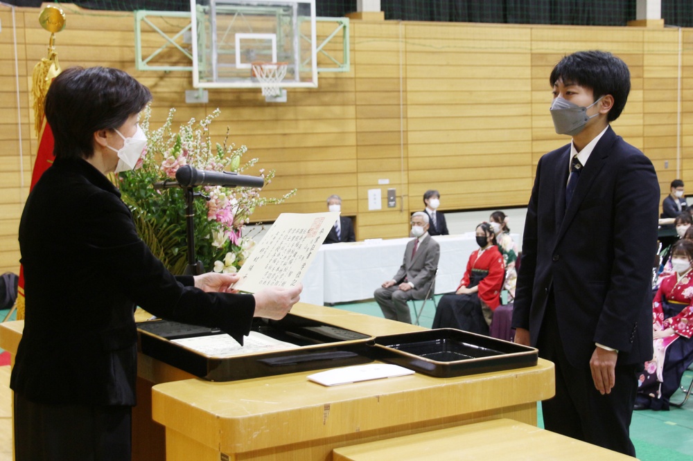 また、2年生の田甫真鈴さんが在校生を代表して「コロナ禍でも前向きにとらえ精力的に活動する姿やサークルなどでの成長につながるような指導から多くのことを学んだ。先輩たちを見習い、在校生として恥のないよう活動する」と送辞を読み上げ、最後に卒業生を代表して中田祥文さんが「コロナ禍で当たり前が当たり前ではなくなり、学生生活ではやりたくてもできなかったことが数知れないが、実習では感染対策を踏まえ実践的に学ぶことができ、地域に根ざした教育とともに成長とげることができた。自分自身の「矜持」を持ち続け、これからの道を晴れやかなものにしたい」と答辞を送りました。