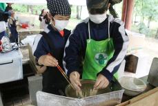 初日は、比翼・晨光の滝を散策し、夕食は協力し合ってカレーライスづくり。飯ごう炊飯でお米を炊くなど、普段行わない工程に戸惑いながらもお互いに助け合いながらカレーライスが完成。自分たちで手作りしたカレーライスに舌鼓を打ちながら完食していました。
