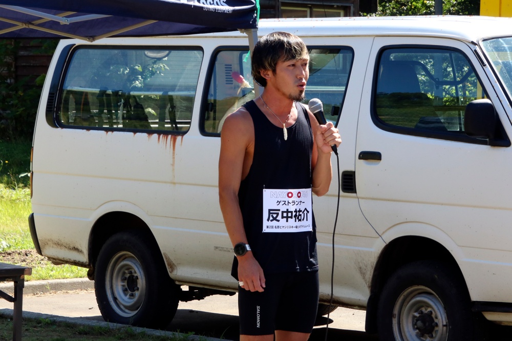 ゲストランナーに阿部雅司さん、中川町を拠点にトレイルランナーで活躍されている反中祐介さんをお招きし、参加したランナーと一緒に声をかけながら第一ゲレンデ頂上までの746メートルを走りました。