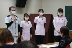口の中の健康について名寄歯科医院の室田弘二院長が解説、名寄歯科医院の歯科衛生士である馬場さん、松原さん、鈴木さんが参加者の口内健康の測定し、口のストレッチ体操をレクチャー。