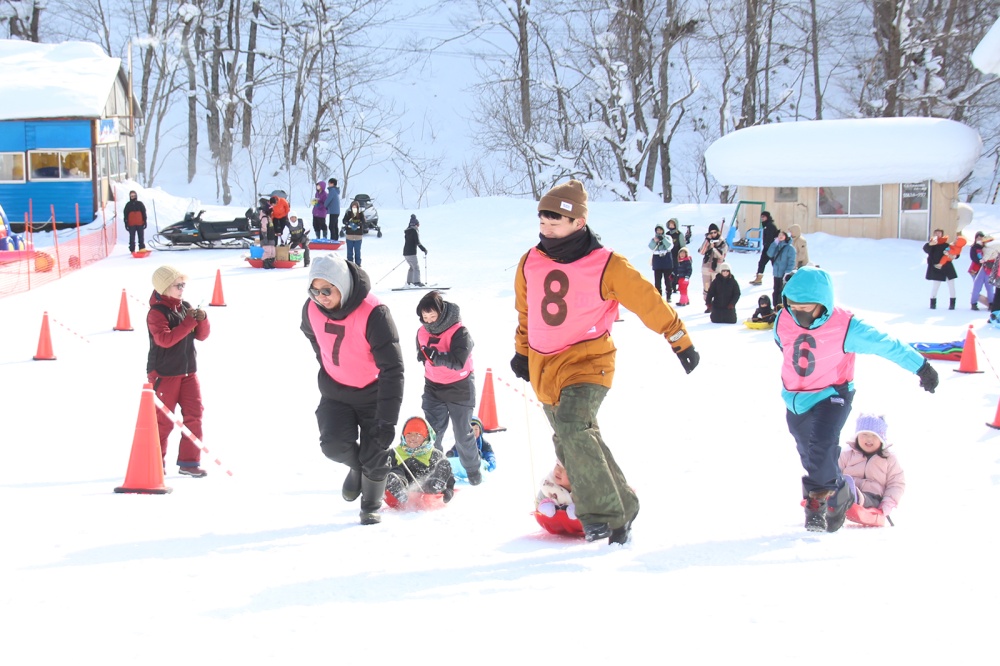 21日は、リフトが終日無料開放され、リフト前は長蛇の列に。また「スキーランニングバイクレース」や「そり☆りんピック」などの子ども向けイベントが行われ、参加した親子たちはとても楽しそうな表情で身体を動かしていました。その他、自衛隊によるスノーモービル体験や自衛隊スキーの装備体験、キッチンカーの出店も見られ、今シーズン最低気温である-24.6度を観測する中、ホットなイベントを多くの人が楽んでいる様子でした。