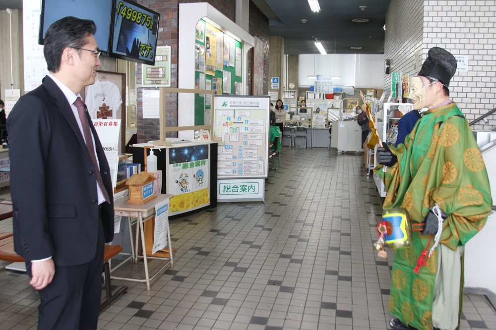 2024年2月2日 鬼追いまつり 市役所名寄庁舎で、3日の節分に因み鬼追いまつりが行われ、赤鬼・青鬼・福の神が訪問しました。 加藤市長は豆をまいて鬼たちを追い払い、福の神とともに無病息災・商売繁盛・交通安全などを祈願しました。 記事で紹介している写真です。写真を選択すると別ウィンドウで大きいサイズの写真が表示されます。