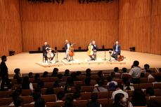 本公演は18時30分からですが、11時から市内中学校4校の全校生徒500人超を集め、ワークショップを行いました。約1時間の短い時間の中で自己紹介やチェロについての説明、質問コーナーを実施し、さらに全5曲の演奏を披露しました。質問コーナーでは3人が今まで習った英語を駆使して質問。4人はそれぞれの質問に優しくおもしろく回答してくれました。心にしみる優しいサウンドとユーモアのある演奏スタイルは中学生が自然と声を上げてしまうほど。中学生からのアンコールもあり、全ての演奏が終わった後は盛大な拍手が4人に送られました。今夜の公演はさらにボリューミー、ますます期待が高まります。