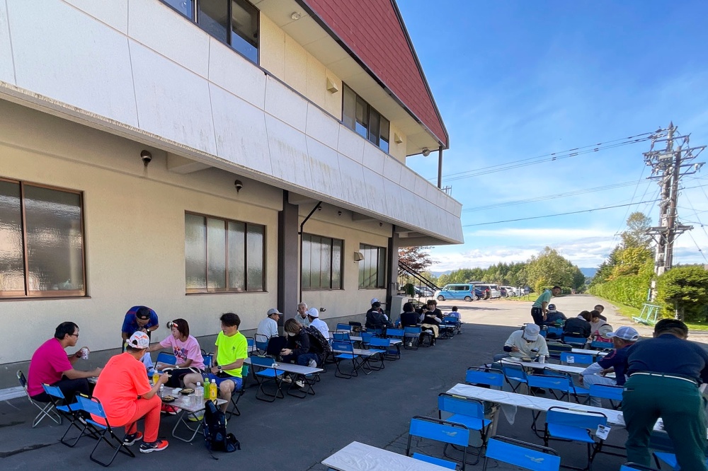 参加者は無料開放された浴場で汗を流した後、なよろ煮込みジンギスカンを食べ、秋晴れの空の下ゴルフ場の雰囲気を楽しんでいる様子でした。