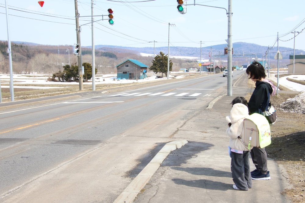 4月10日、入学したてのまだランドセルが大きく見える1年生、最初の1週間は4時間授業、午前中で学校は終わりです。授業が終わると先生と一緒に学校を出ていきます。暖かい日差しとは反対に、まだ少し冷たい風が吹く中、学校から約400メートル離れた場所にあるバス停を先生と二人で目指します。ランドセルには定期券が揺れていました。
