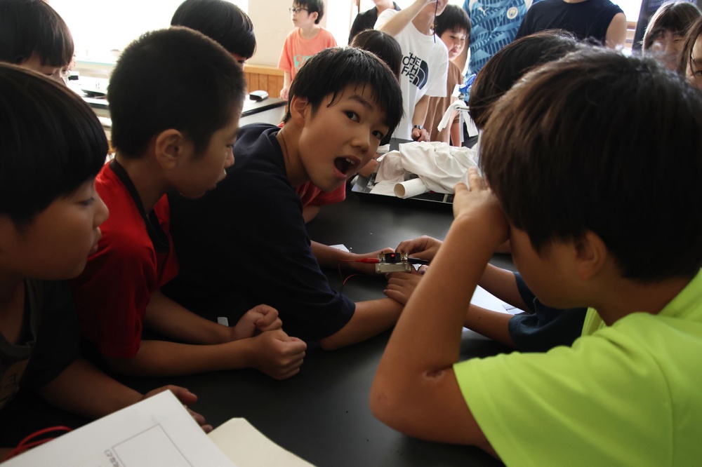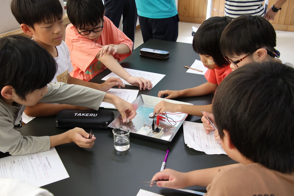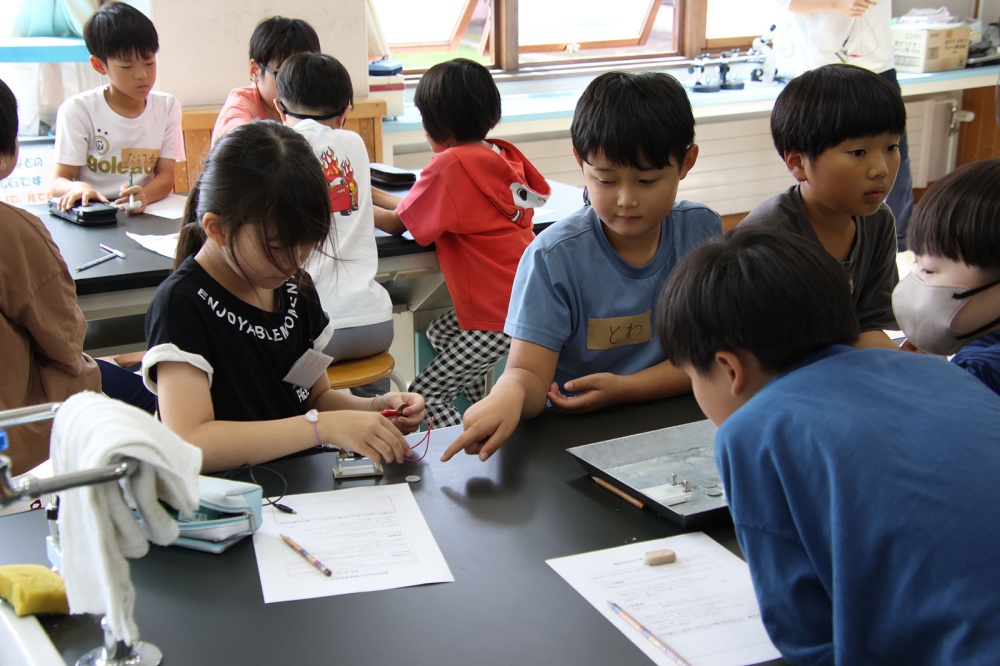 3時間目の理科の授業をのぞいてみましょう。今回は「身近なもので電池を作ろう」、実験をするようです。児童は3班に分かれ、それぞれの班に智恵文小中学校の児童が入ります。実験の準備もみんなで手分けをして進められました。先生の指示で10円玉と1円玉を4まいずつ重ねて「44円電池」の回路を作りますが、なかなか実験は成功しません。次に炭にアルミホイルを巻いて回路を作ってみますが、これもうまくいきませんでした。最後は3班の44円を集めて「132円電池」を作りました。するとこちらは大成功。みんなで作った回路は「発光ダイオード」に明かりを点けました。児童たち、先生も大喜び。実験は大成功です。
