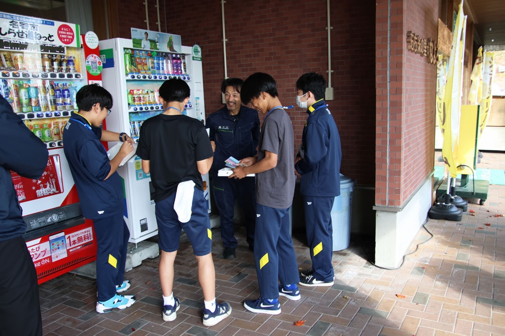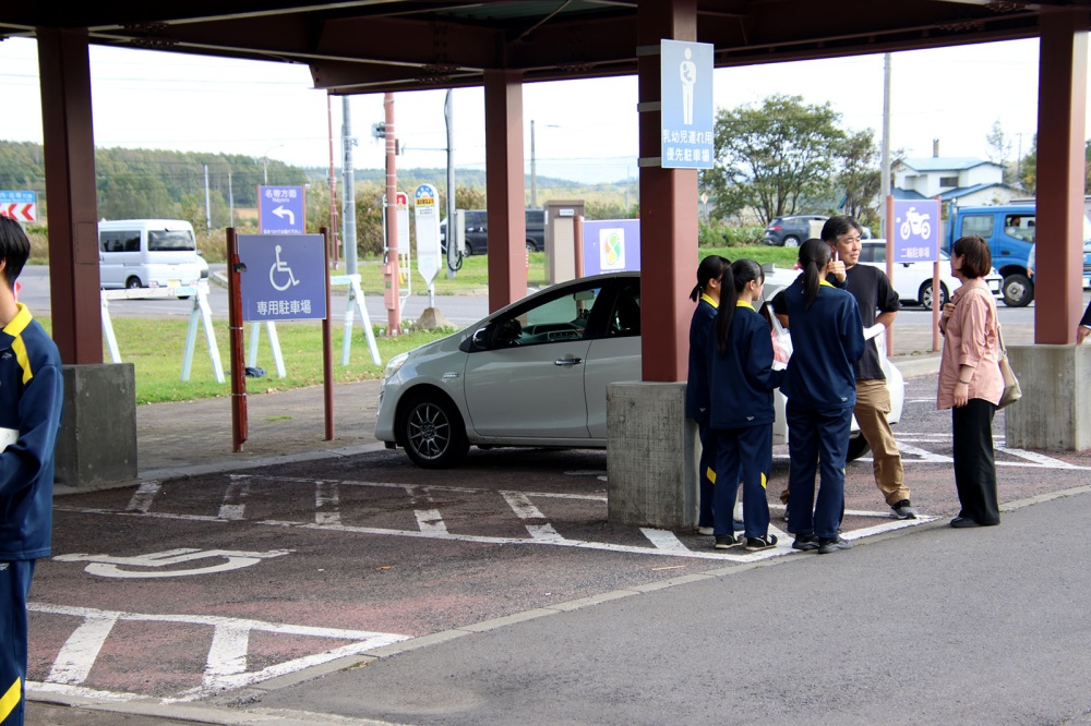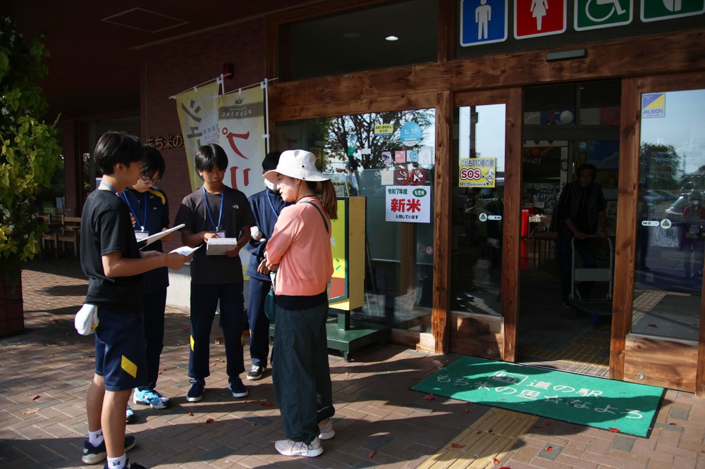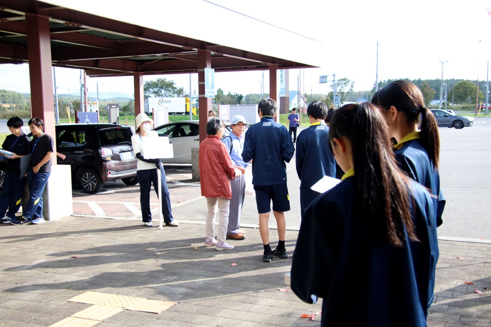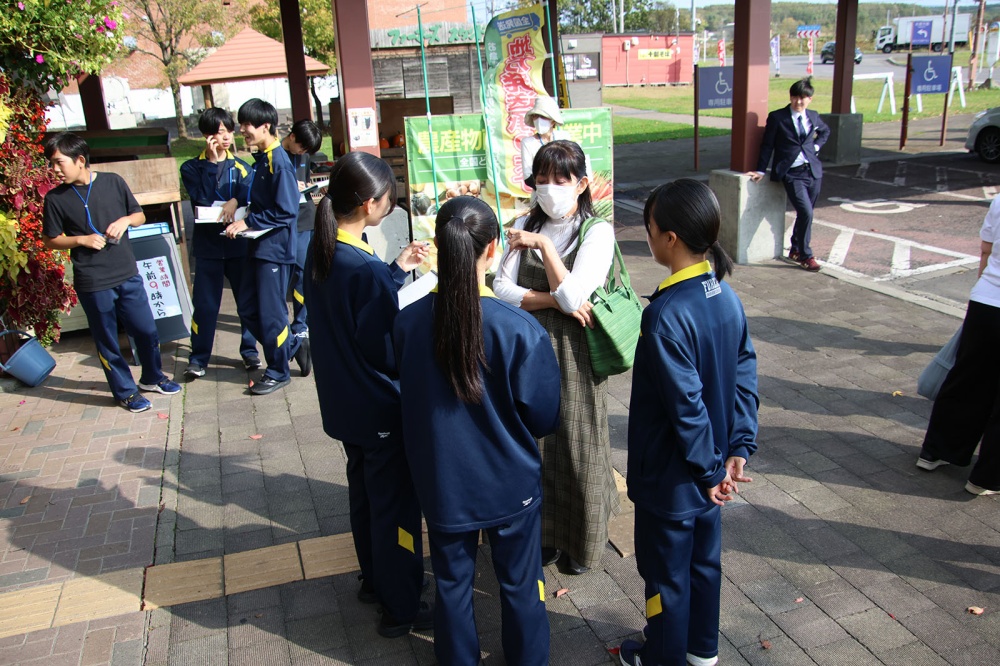 今回は「まちおこしプロジェクト」の一環。事前にほかの地域の「道の駅」を調べ、人気のある道の駅と風連の道の駅との違い、課題を自分たちで考えました。今回は利用者の意見を聞き、自分の感じたことと実際の利用者の声から、「よりよい道の駅」を作るにはどうしたらいいのか考えます。最初は遠慮がちだった生徒たちも少しずつ慣れてきて買い物終わりの利用者さんにお話を聞くことができていました。「利用頻度は?」、「利用目的は?」、「道の駅にどんな施設が併設されてたらいい?」、「他にどんなものが売っていてほしい?」、各班で考えた課題解決に向けた質問を投げかけると、多くの利用者が快く答えてくれ、インタビュー後には「がんばってね」などの声をかけてくれる方もいました。