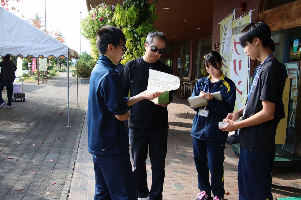 10月3日、13時半、道の駅に歩いてくるおそろいのジャージの集団。風連中学校の3年生22人が道の駅利用者にインタビューを行いました。