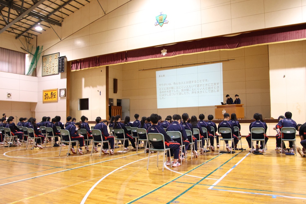 事前に同じ事業所に行く生徒同士で班を作り、「探求課題」を明確にして職場体験に臨みました。それぞれの業種で、どんなことに気を付けながら仕事をしているのか、働く人の思いや仕事のやりがいなども職場体験する中で感じ取ることができたようです。発表はクイズや実演をする班、生徒に実体験してもらう班など多彩で、来ていた保護者も楽しそうに聞いていました。