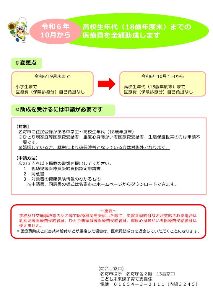 名寄市では、高校生年代までの医療費を全額助成しております。