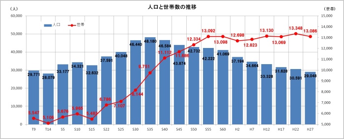 | 平成2年 | 10,797世帯 | 367世帯減少 | 30,776人 | 3,303人減少 |