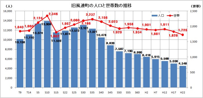 | 平成22年 | 1,725世帯 | 103世帯減少 | 4,548人 | 490人減少 |