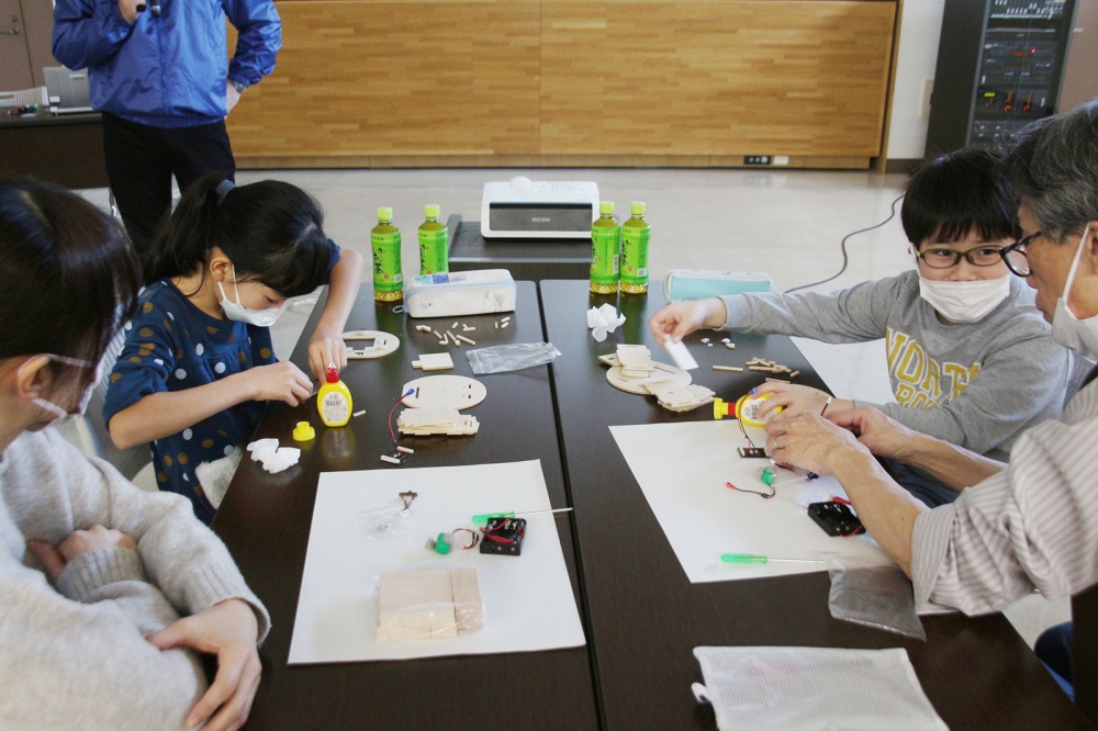 駅前交流プラザ「よろーな」で『「ゼロカーボン」を親子で学ぼう』がテーマのソーラーランプ工作教室が行われ、親子20人が参加しました。