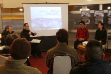 初日の20日は、BBQハウスでトークイベントが開催。「ピヤシリで育む、子どもたちの未来」「ピヤシリ、これからの50年に向けて」の2本立てで行われ、ピヤシリアルペンスキー少年団の寺島峻介さん、ピヤシリスノーボードスクールの鷲見悦朗さん、名寄市立大学の清水幸子准教授、倶知安町在住のフォトグラファー・渡辺洋一さん、名寄振興公社の三好一展さん、前北国博物館長の吉田清人さんがステージでトークセッションを行いました。
