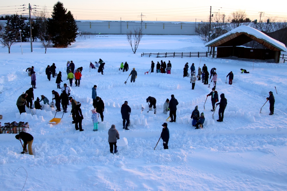 雪をブロック状に切り出し、ろうそくを差し込む穴を開け、ランタン状に雪を削り、スノーランタンを作成。「ベイマックス」のキャラクターを表現するよう、参加者たちで協力しながら並べました。
