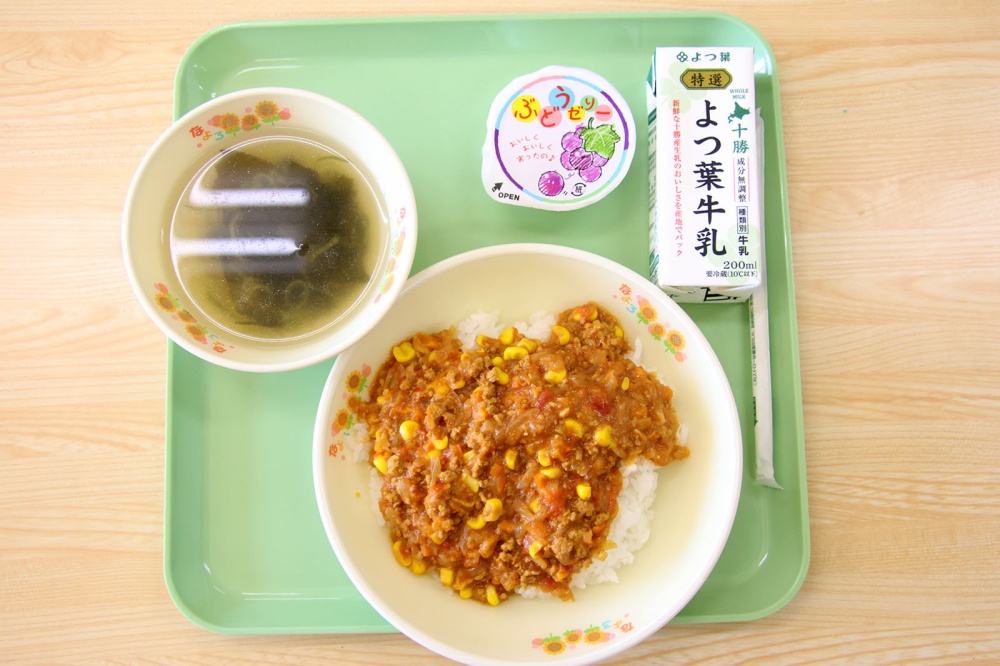 9月24日の給食は「コーンたっぷりキーマカレー」、「牛乳」、「わかめスープ」、「ぶどうゼリー」。