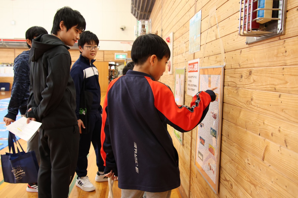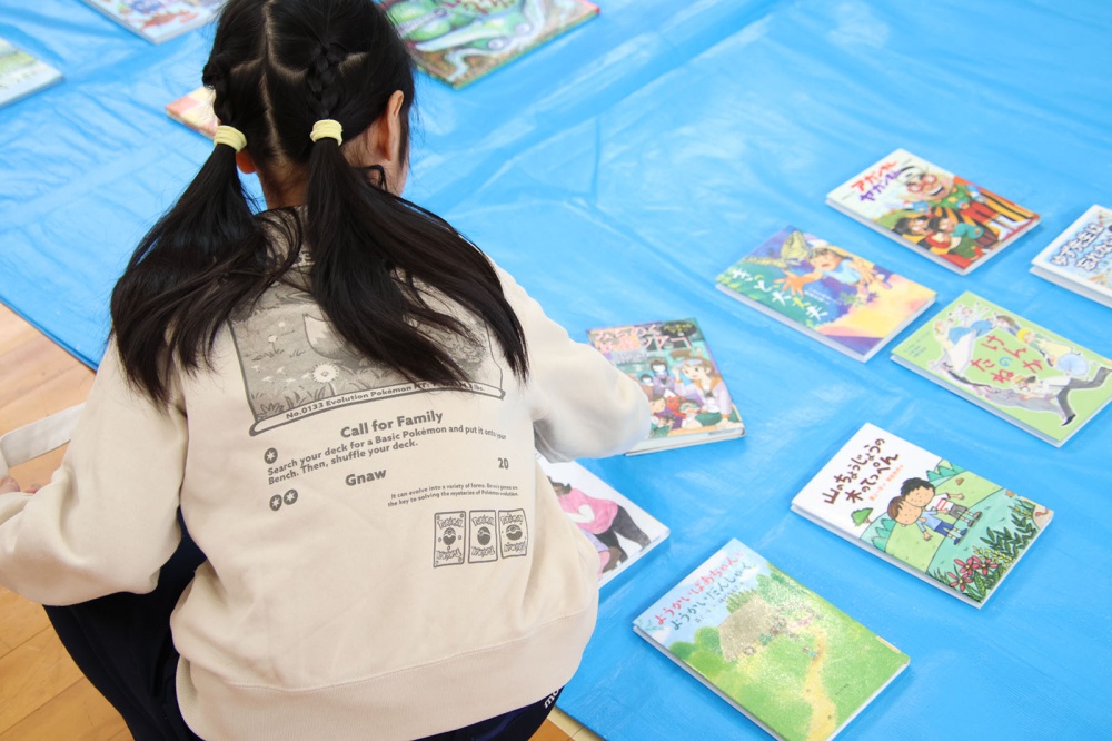 オープニングは名寄本読み聞かせ会の読み聞かせでスタート。絵本「ありがとうのうたをうたえば」と紙芝居「じごくけんぶつ」、児童たちは真剣に本・紙芝居を見つめていました。読み聞かせが終わって振り返ると、そこには体育館いっぱいに敷き詰められた本。気になった本は10冊以内でそのまま貸し出しが可能で、冬休みの期間中借りられます。児童たちは思い思いに本を見て回り、気になる本を手にとってはカバンに入れていました。壁には物語のとおりに進まないとお話が続かない「おはなしめいろ」、貸出はできないけどその場で読むことができるいろいろな仕掛けがある「しかけ絵本」の展示などもあり、普段見ることのない「本」の形に児童たちは興味津々でした。