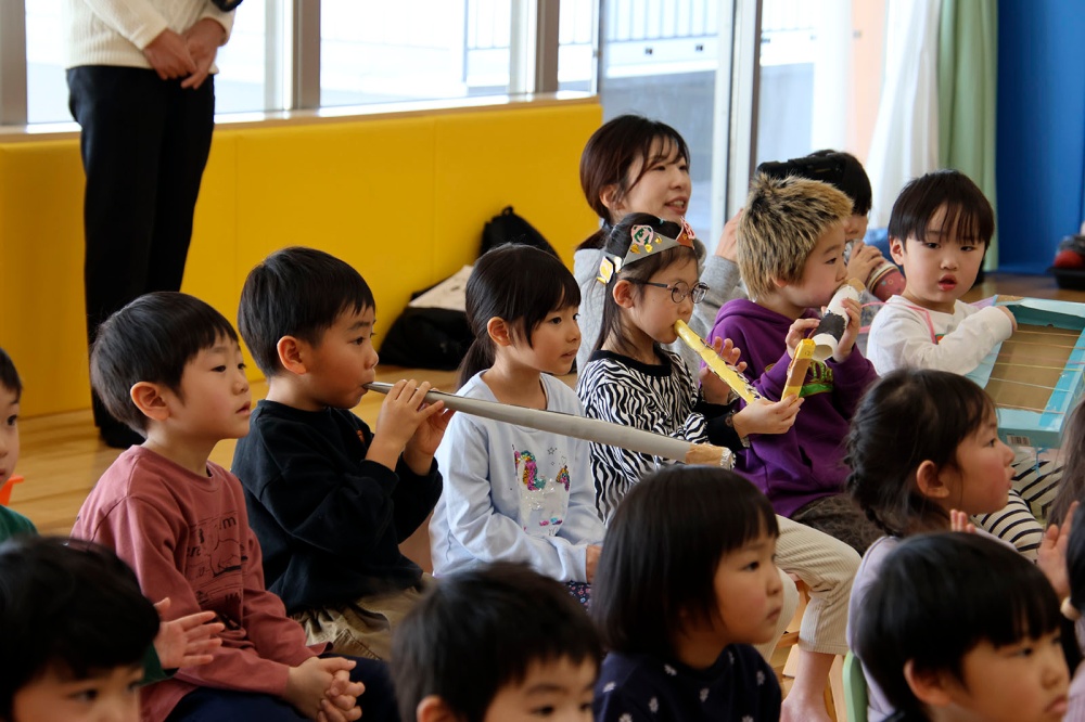 会場には「さんぽ」や「ぼくたちぶどう」などの楽曲が響き渡り、園児たちは目を輝かせながら、思い思いに作った楽器を手に、演奏に合わせて体を揺らしました。
