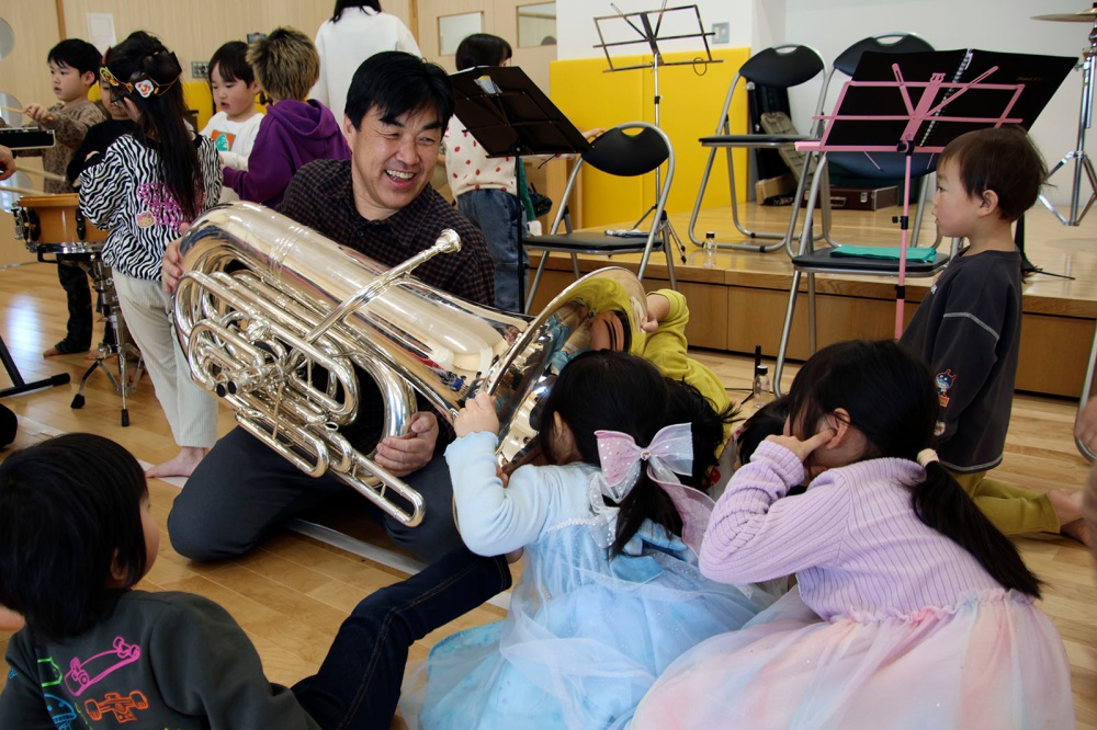 演奏会の後は、実際に吹奏楽団の皆さんが使用している楽器に触れる体験も実施。普段なかなか見ることのない本物の楽器を手に取り、音を出してみるなど、園児たちにとって貴重な音楽体験のひとときとなりました。