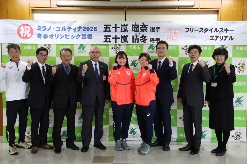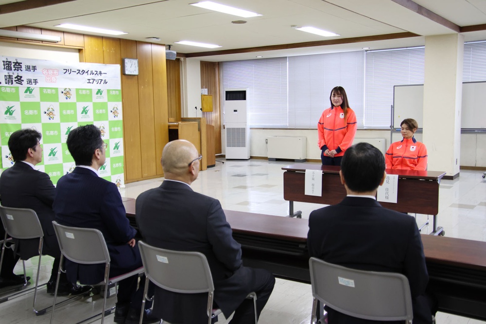 2月4日、ミラノ・コルティナ2026冬季オリンピックに出場する五十嵐瑠奈選手が名寄市役所に表敬訪問に来てくれました。兄で男子の代表選手となった晴冬選手は先日の練習で足を痛め、今回は欠席。コーチの逸見佳代さんと2人です。