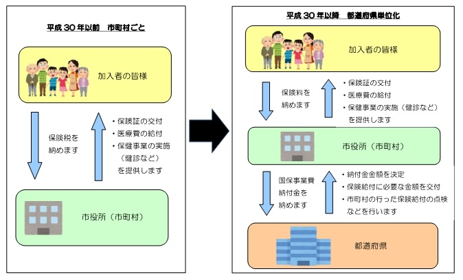 平成30年度から、国民健康保険の財政的な運営は市町村単位での運営から都道府県単位での運営に変わりました。
